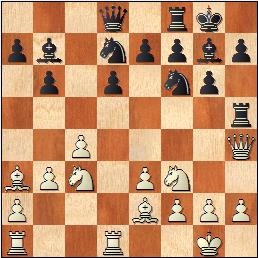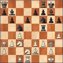 18…g5?! Svart spelar konsekvent aggressivt. Mer sunt var exempelvis 18…Re5!? för att tvinga vit till en förklaring med sin ogarderade bonden på e3. 19.e4?! Starkare var 19.Qh3! Bc8 20.b4 med vit fördel. Svart har ingen farlig avdragare med tornet och damen kan gå undan till h2. 19…gxh4 20.Qxh4 Rh5 21.Qf2 Ne6? Bättre var 21…Rg5 för att kunna besvara 22.f4? med 22…Ng4 22.f4 Ra5 23.Bb4