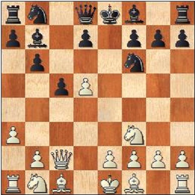 8.Bg5!? Den vanligaste varianten är 8.e4 Qe7 9.Bd3 Nxd5 10.0-0 Nc7 11.Nc3 med spel för bonden. 8…Bxd5 9.Nc3 Bc6 9…Be6 10.e4 Nc6 11.0-0-0 och vit har kompensation. 10.e4 Be7 11.e5 Nd5 12.Ne4 f6 12…Bxg5 13.Nfxg5 0-0 14.Bc4 h6 15.Bxd5 hxg5 16.Nf6+! gxf6 17.Qg6+ Kh8 18.Qh6+ Kg8 19.exf6 och vit vinner. 13.exf6 Nxf6 14.Bxf6 gxf6 14…Bxf6 15.Nd6+ Kf8 16.0-0-0 och vit har angreppschanser. 15.0-0-0 Qc7